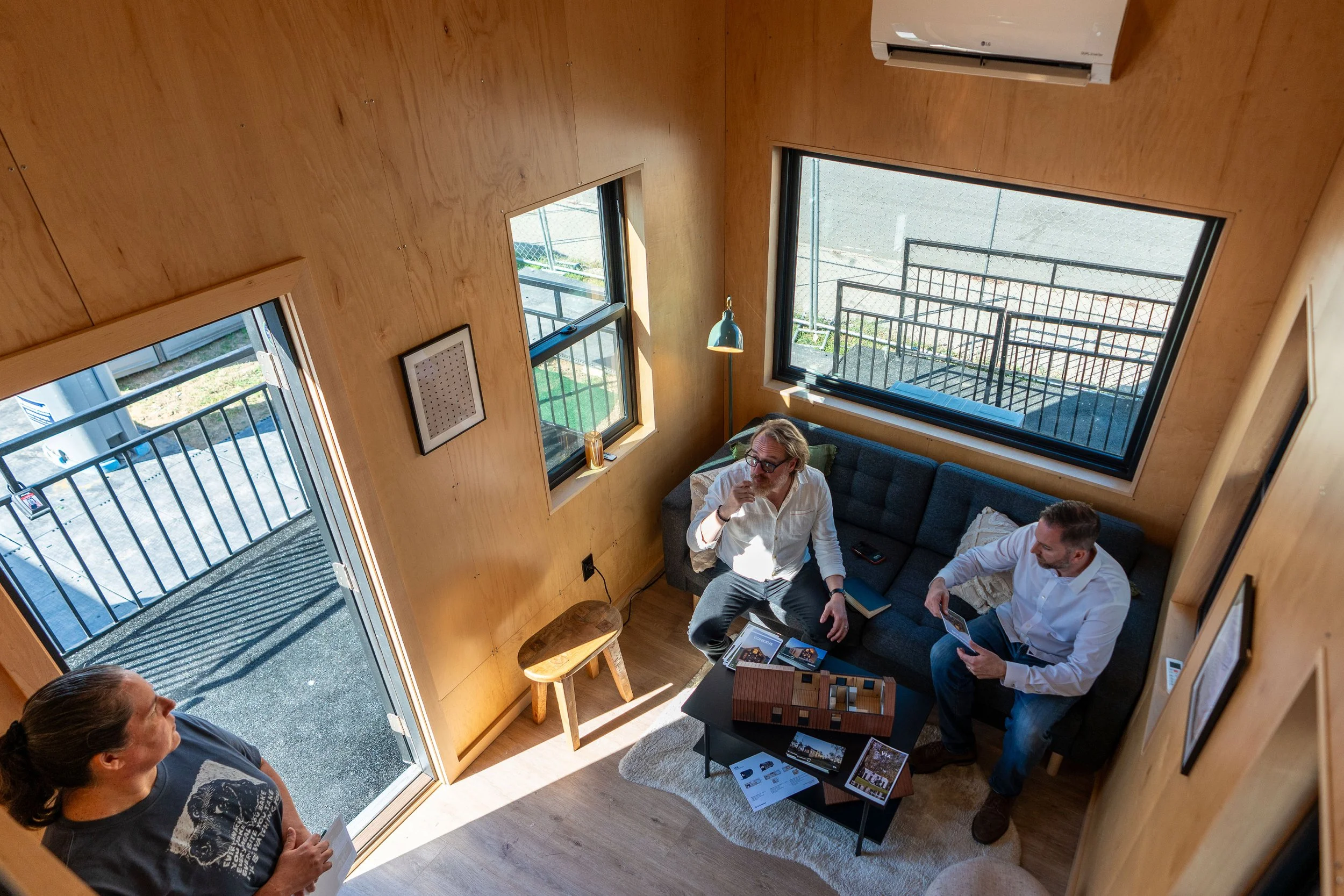 The showcase includes prefabricated units from six companies: AMEG with New Economics for Women, Villa, Azure, Conex Modular, Liv Connected, and Sola/Model Z.